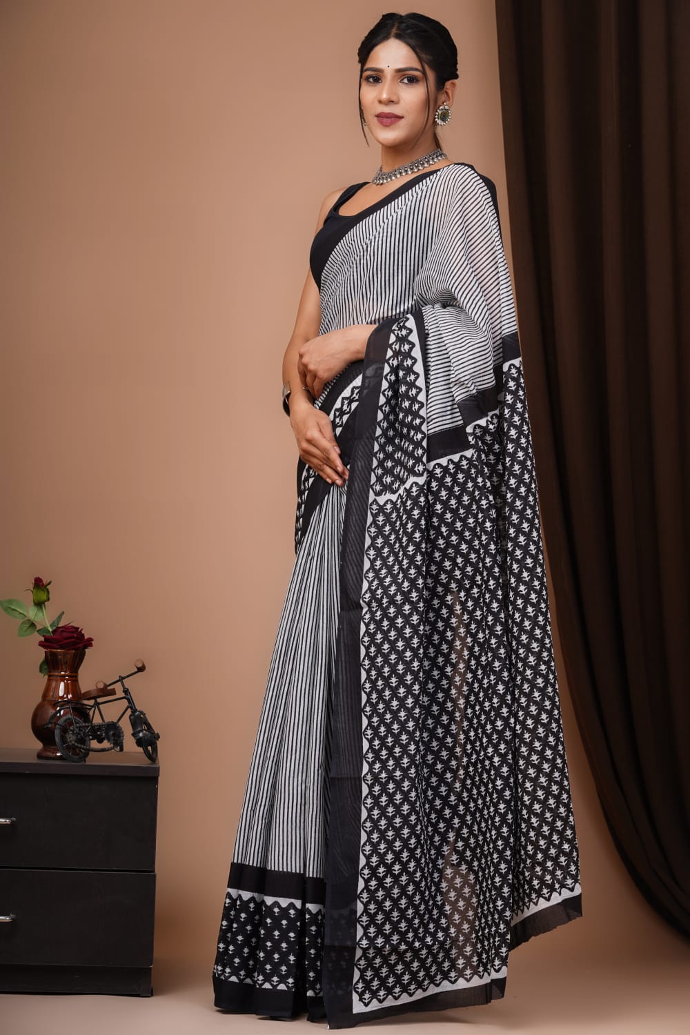 Step out in style with Maahishmati's exclusive Mul cotton Bagru hand-block printed sarees - each a masterpiece, handcrafted by skilled artisans using traditional hand-block printing techniques passed down the generations.