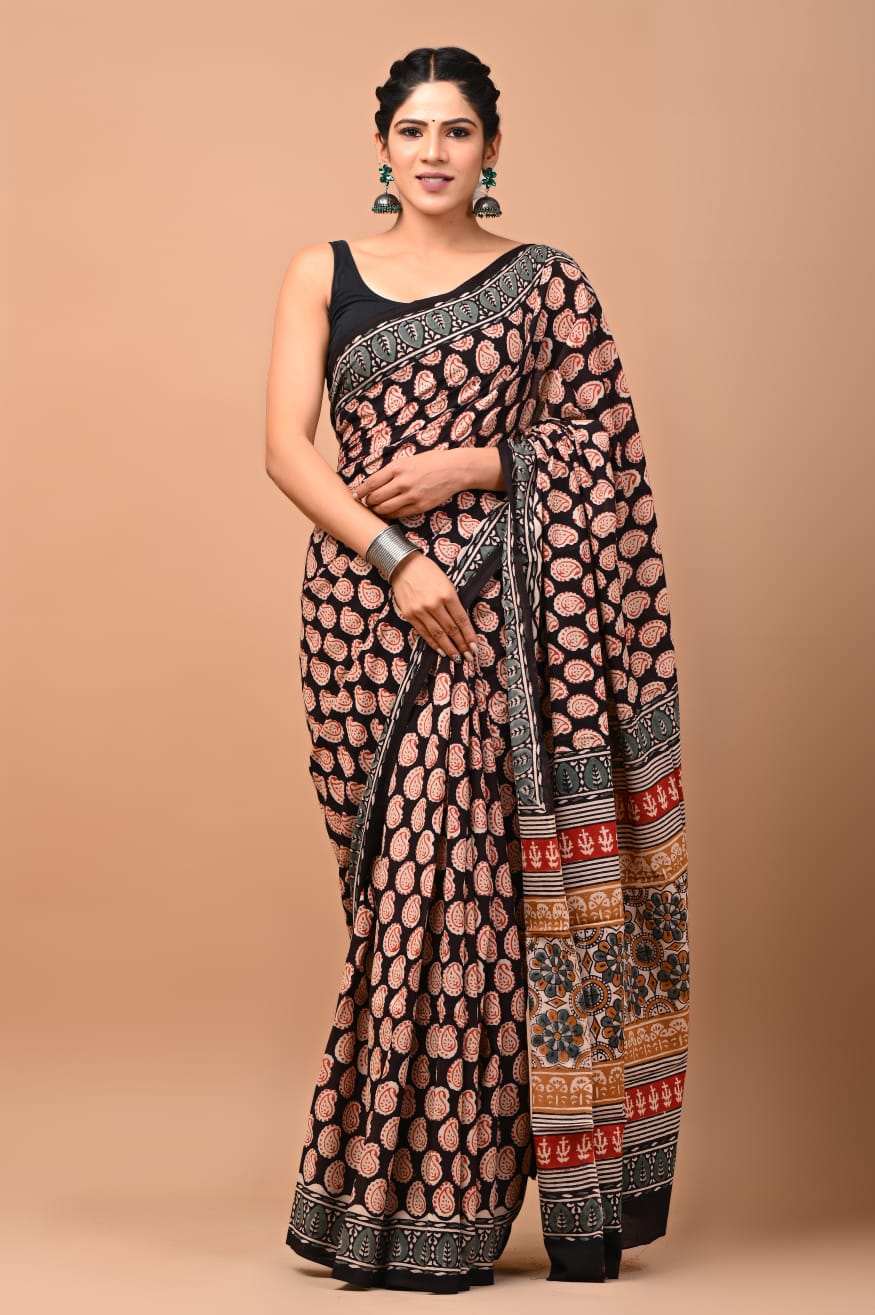 Step out in style with Maahishmati's exclusive Mul cotton Bagru hand-block printed sarees - each a masterpiece, handcrafted by skilled artisans using traditional hand-block printing techniques passed down the generations.