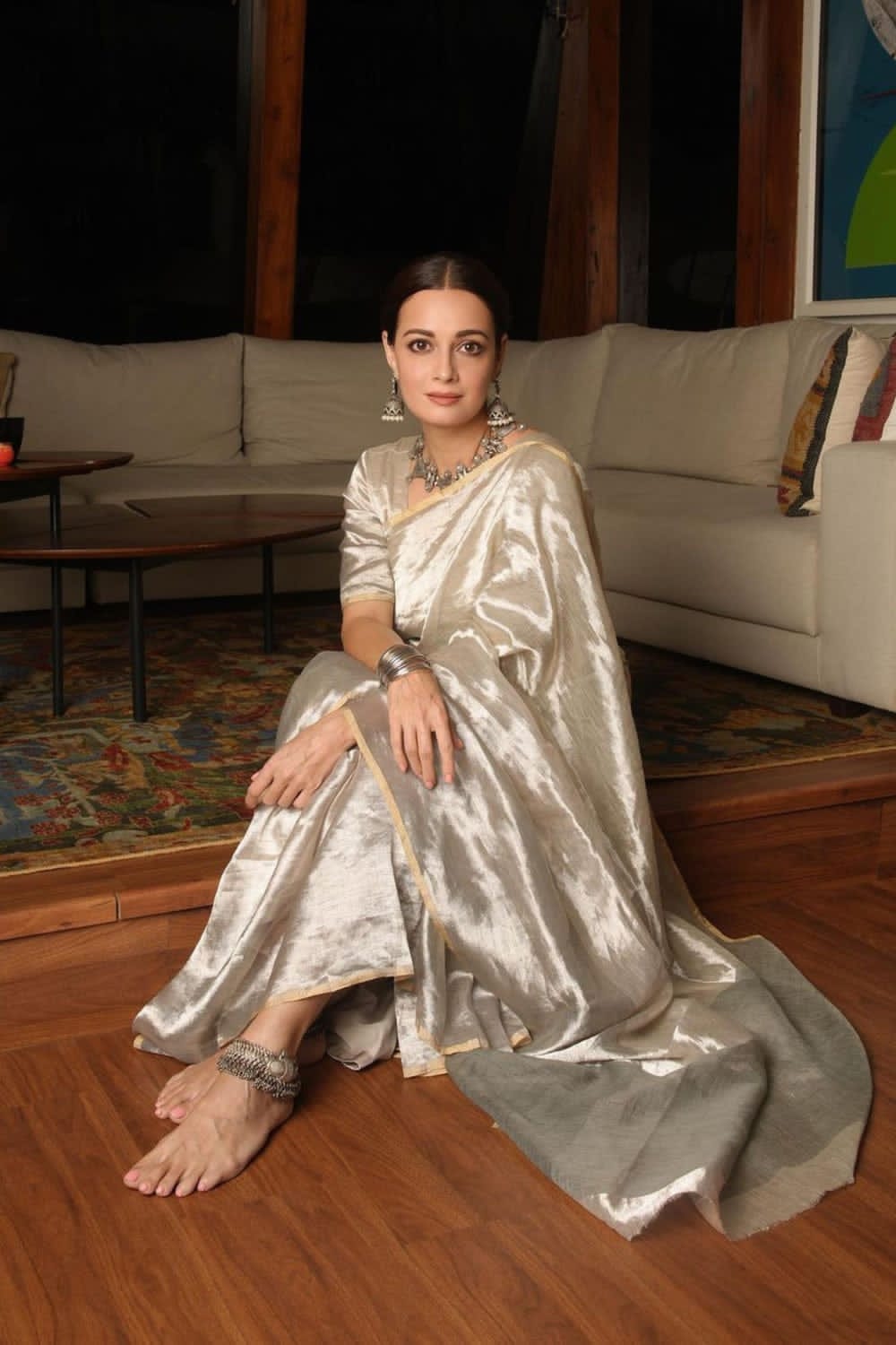 Get this elegant and royal Chanderi handloom tissue silk saree worn by Dia Mirza on Diwali.