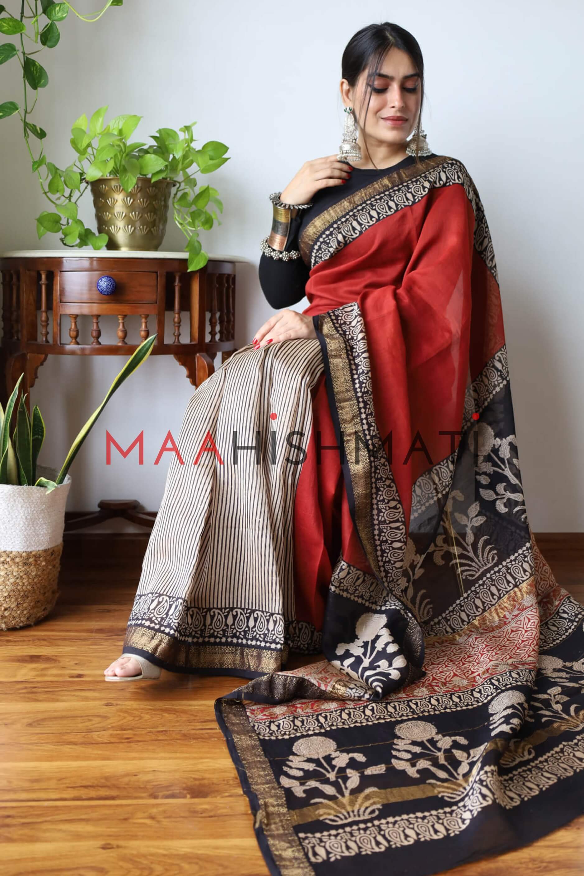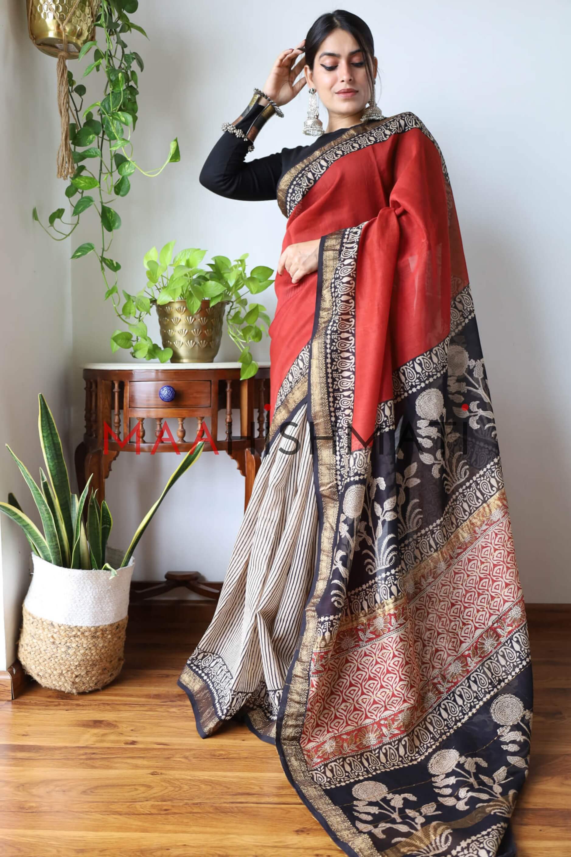 It's soft silk feels like butter on the body and the Bagru hand-block prints give it a rich and unique look. A saree for any day. You can pick this for a casual walk in the neighborhood or wear it to the office. Grab a coffee with your besties or go on dates with your partner. A family get-together or a social function.